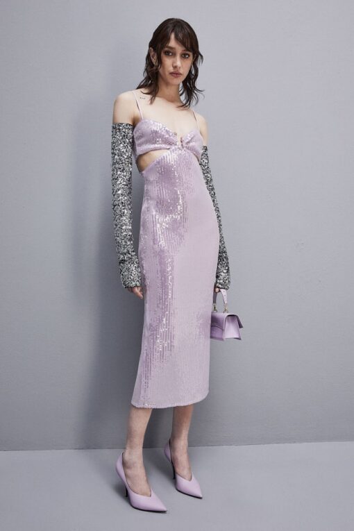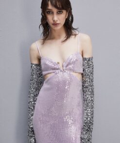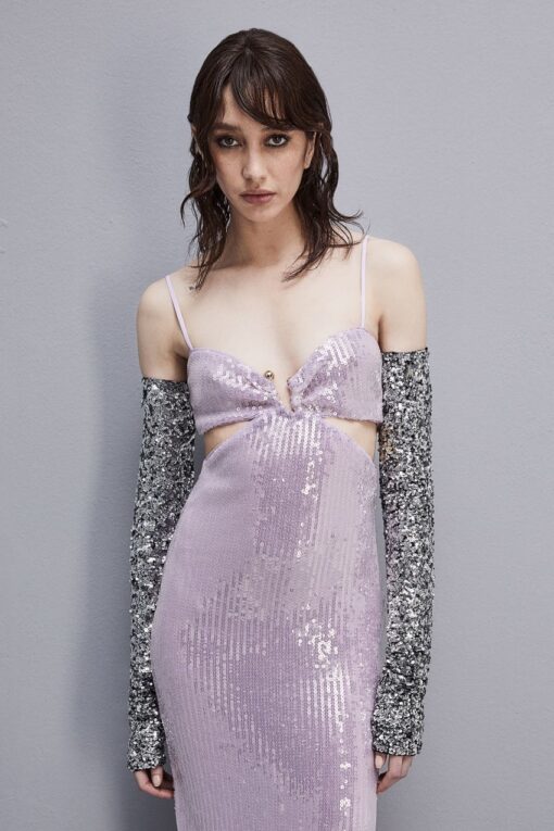 Illumina le tue serate con bagliori glam. Questo abito lungo al polpaccio è carateerizzato da applicazione di paillettes all over e dettagli piercing sul davanti. Presenta uno spacco dietro.
