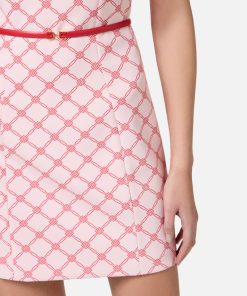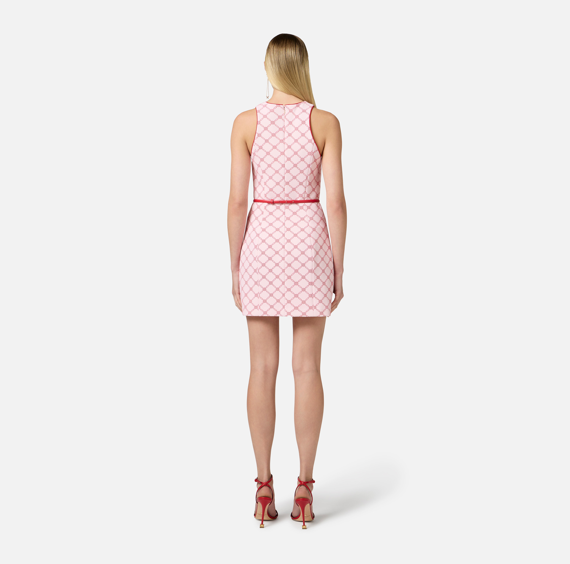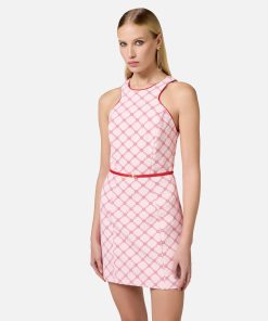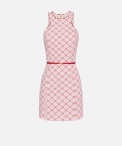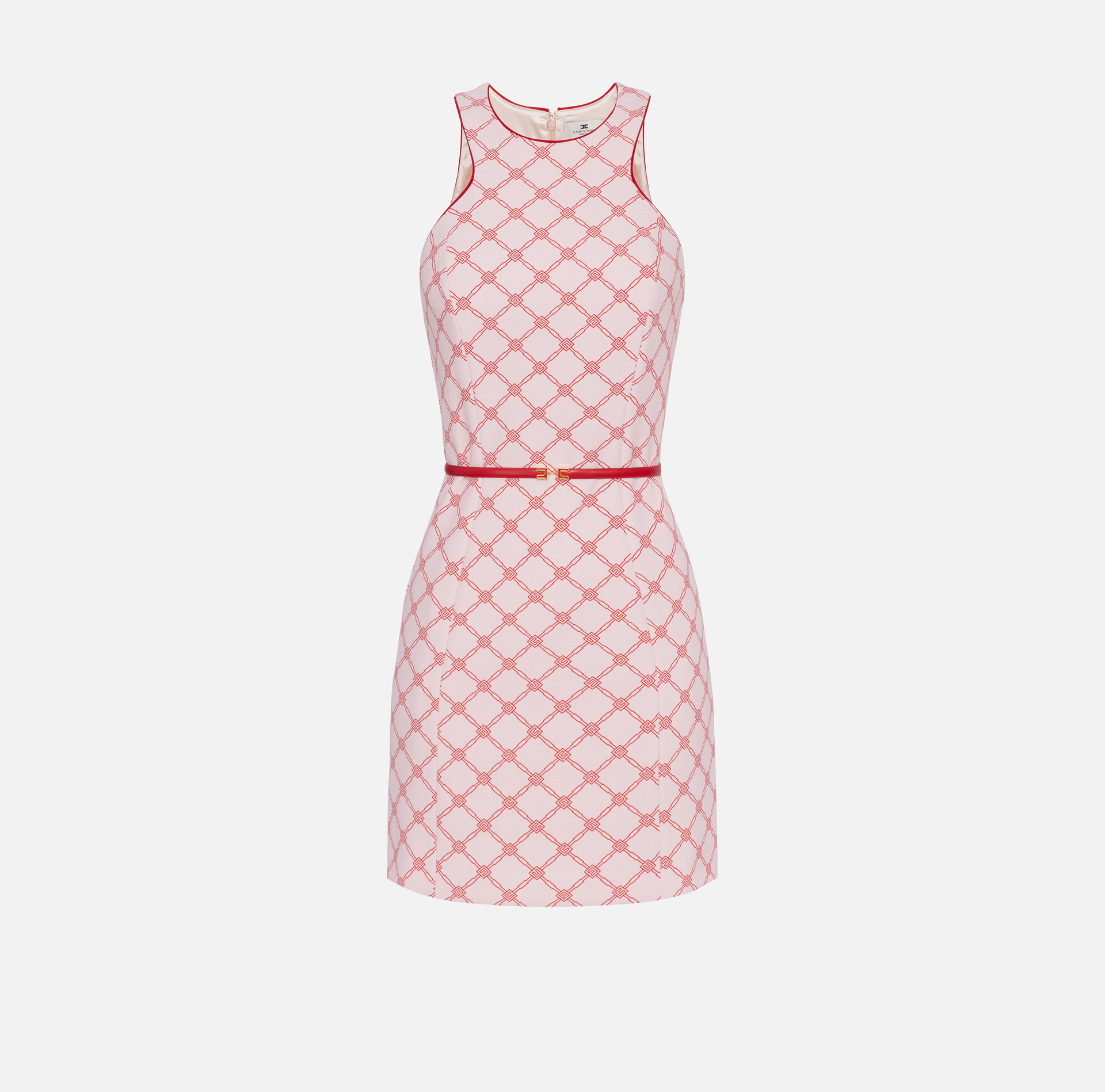 Abito smanicato in crêpe stretch con gonna leggermente bombata. Il vestito si distingue per la stampa all-over a losanghe e il piping a contrasto. Punto vita definito dalla cintura con morsetto gioiello in metallo dorato con logo. Vestibilità aderente.
