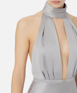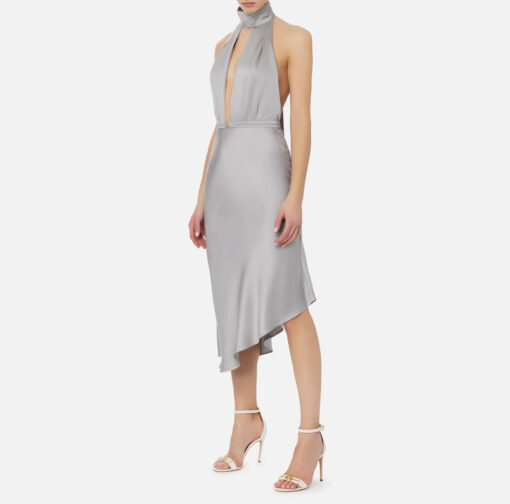Abito midi in crêpe di raso con gonna dal fondo asimmetrico svasato. È caratterizzato da scollo all’americana con profonda apertura a goccia sul décolleté e sciarpa al collo.