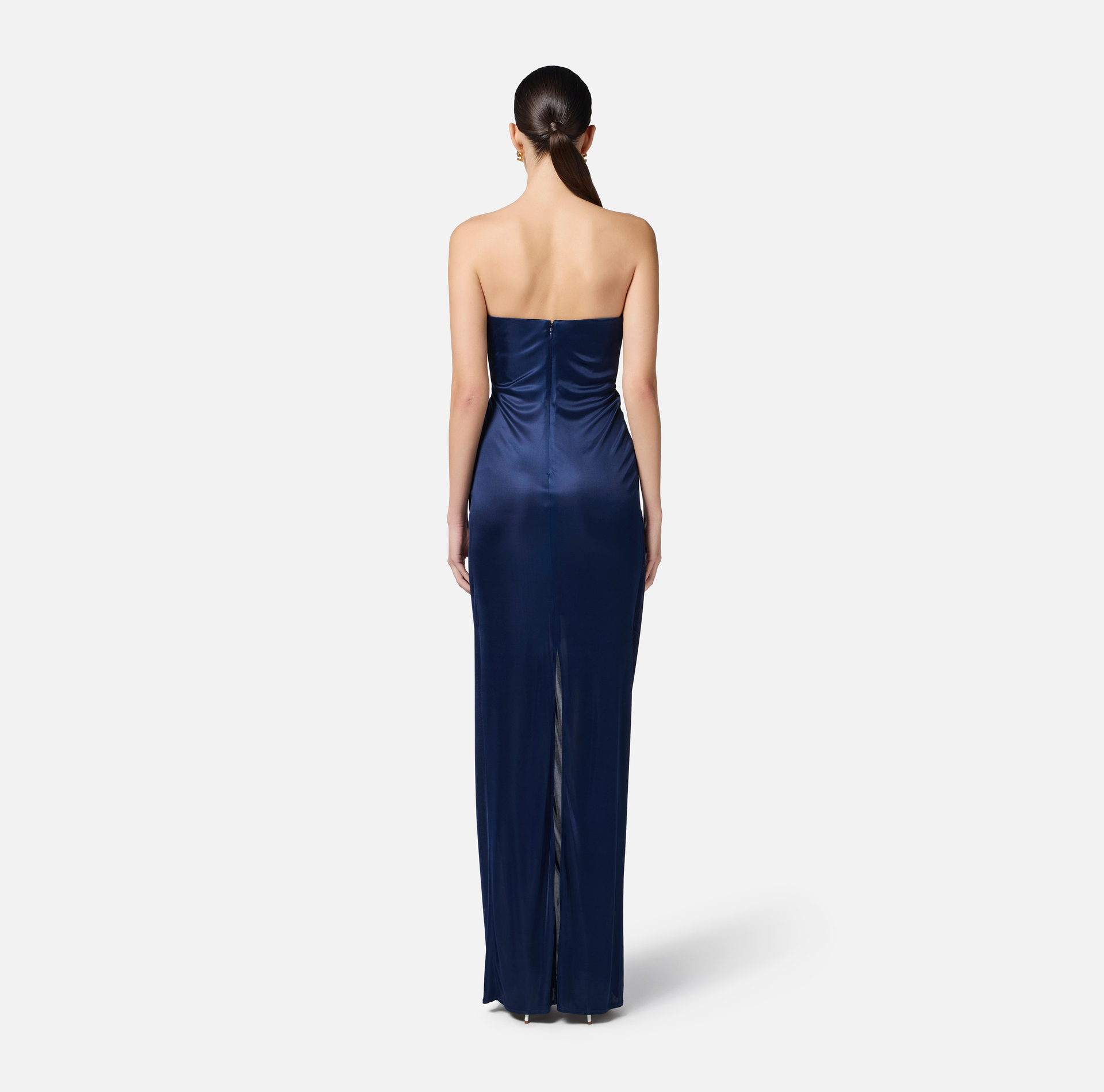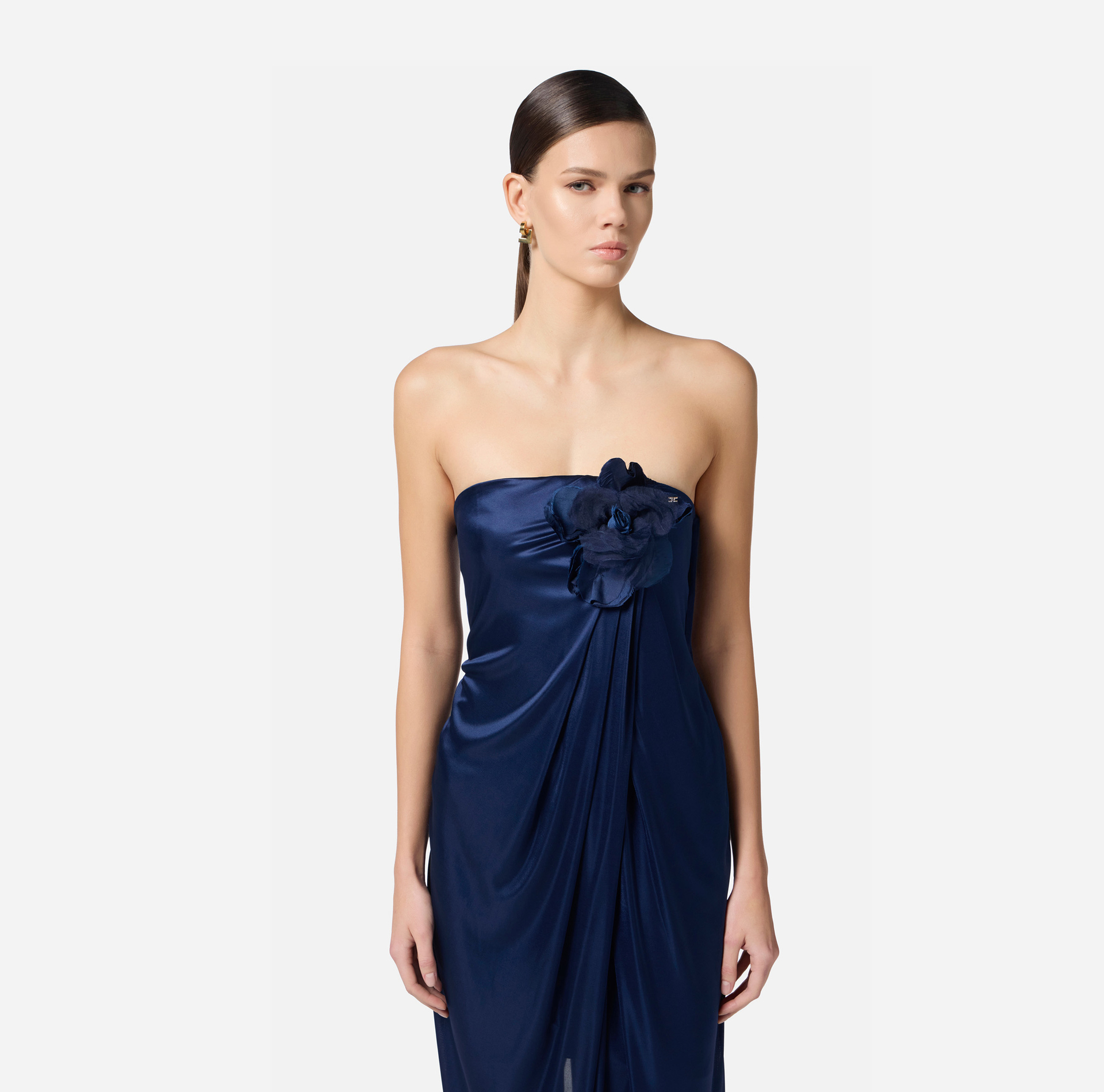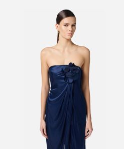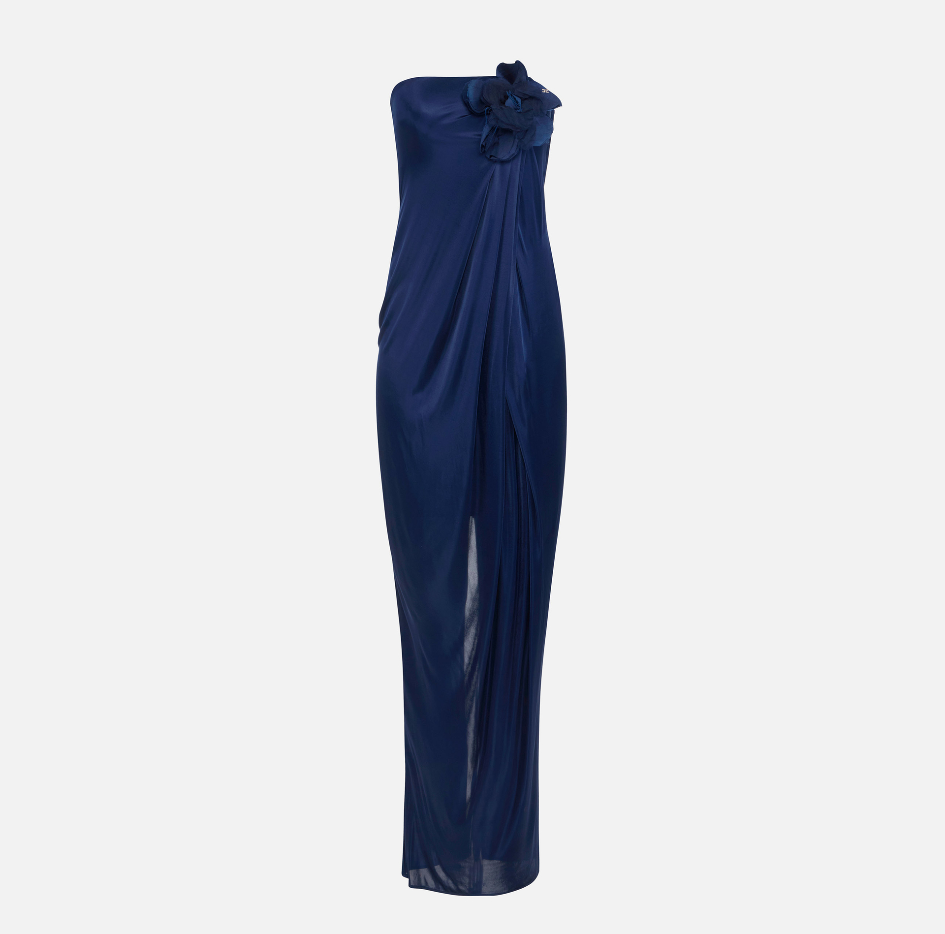 Abito da sera in jersey lucido. Il vestito ha spalle scoperte e si distingue per l’elegante applicazione floreale sul top, impreziosita dal dettaglio logo. I drappeggi che cadono morbidi sulla silhouette regalano un fascino rilassato e disinvolto. Spacco sul retro. Vestibilità slim.