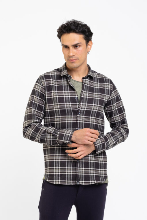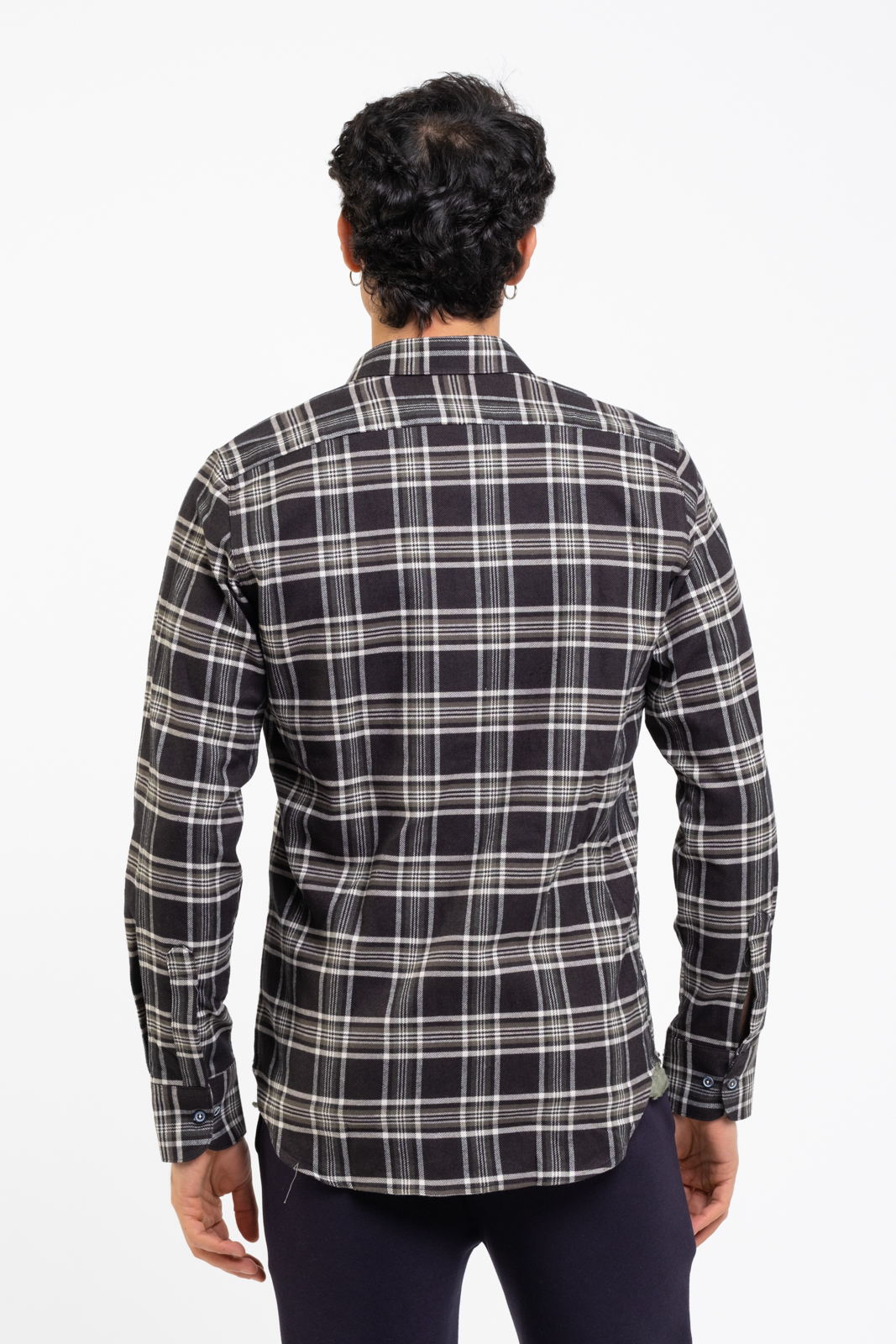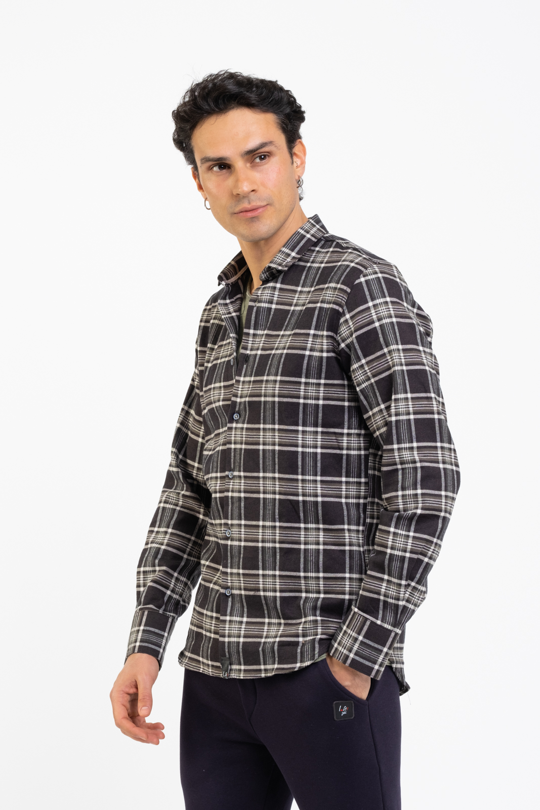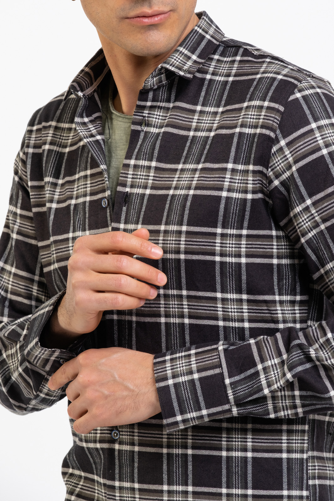 camicia fantasia a strisce e quadri, collo classico, polsini, chiusura con bottoni frontali, vestibilità regolare, applicazioni.