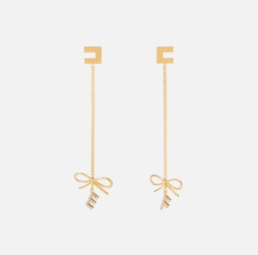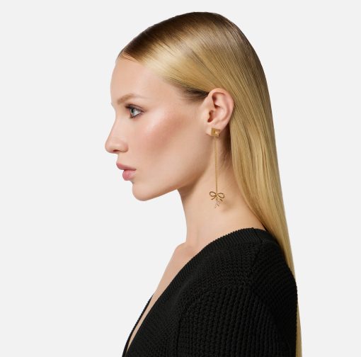 Orecchini realizzati con finitura in metallo dorato caratterizzati da catenine pendenti, impreziosite dai dettagli a forma di fiocco con logo in strass.