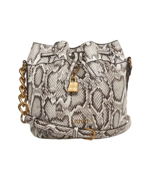 Borsa a secchiello pitonata, chiusura con coulisse, metallica in oro.Tracolla regolabile, charm logato, scritta in lettering frontale.